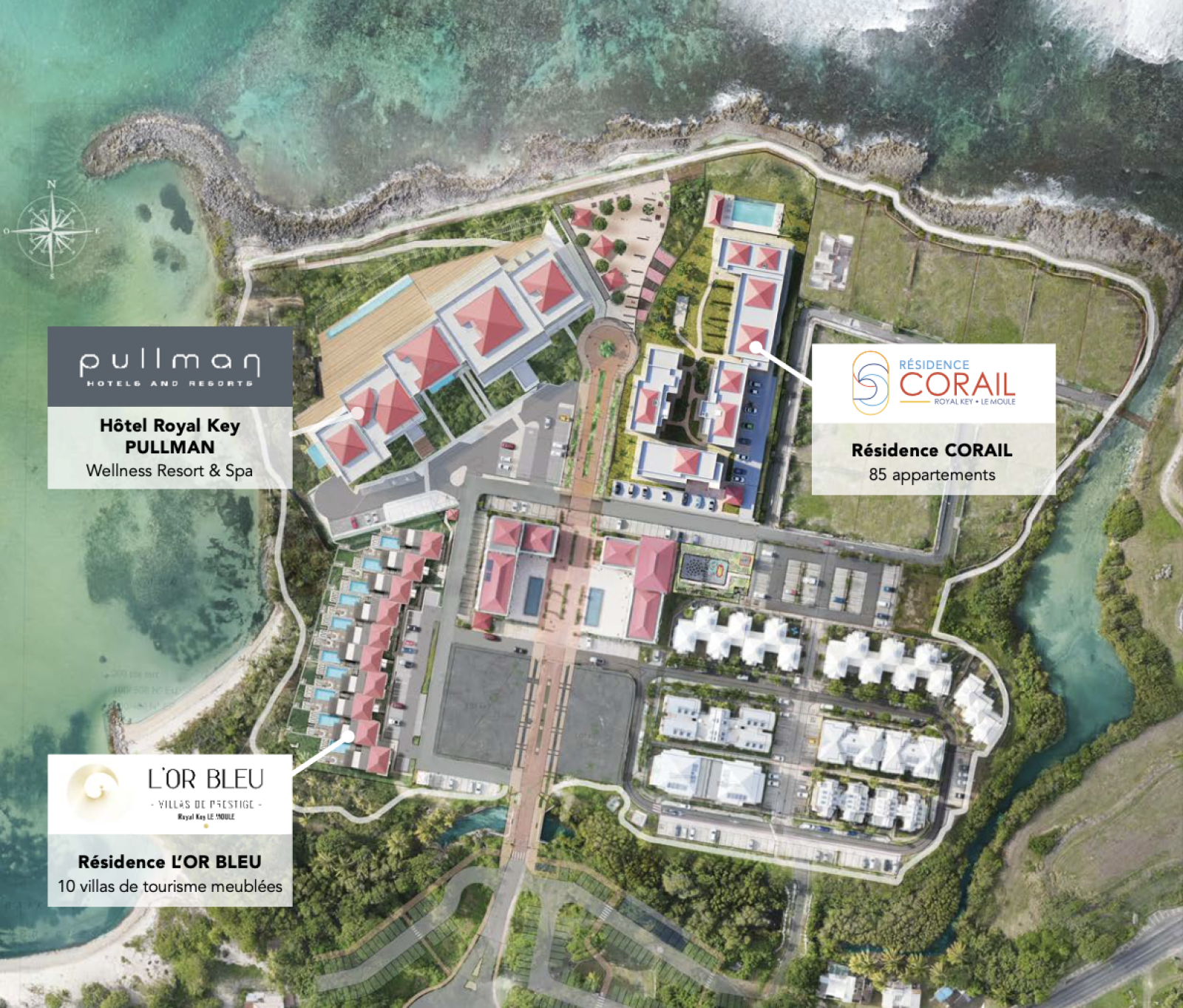 Situé au coeur du quartier Royal Key sur la Presqu’île de la Baie au Moule, la Résidence Corail est nichée dans la station balnéaire la plus porteuse de Guadeloupe, à proximité immédiate du tout 1er Hôtel Spa Pullman (groupe Accor) de la Caraîbe.